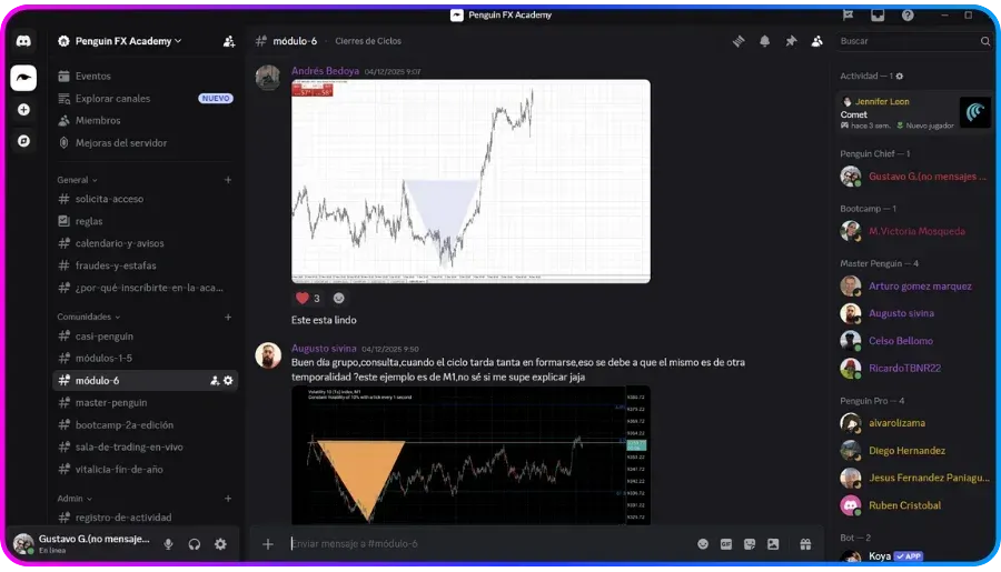 Penguin FX es una academia que te lleva paso a paso por el camino del trading, te lleva desde cero hasta profesional. El mentor Gustavo Guerra lleva un acompañamiento increíble con sus estudiantes, respondiendo todas nuestras dudas, corrigiendo nuestros errores, y siempre motivándonos a mejorar y a dar lo mejor de nosotros. Aquí encontrarás información de primera calidad(adiós a indicadores, S/R, línea de tendencia, etc...etc...), explicaciones bien claras, y precios muy accesibles. Un honor pertenecer a la academia